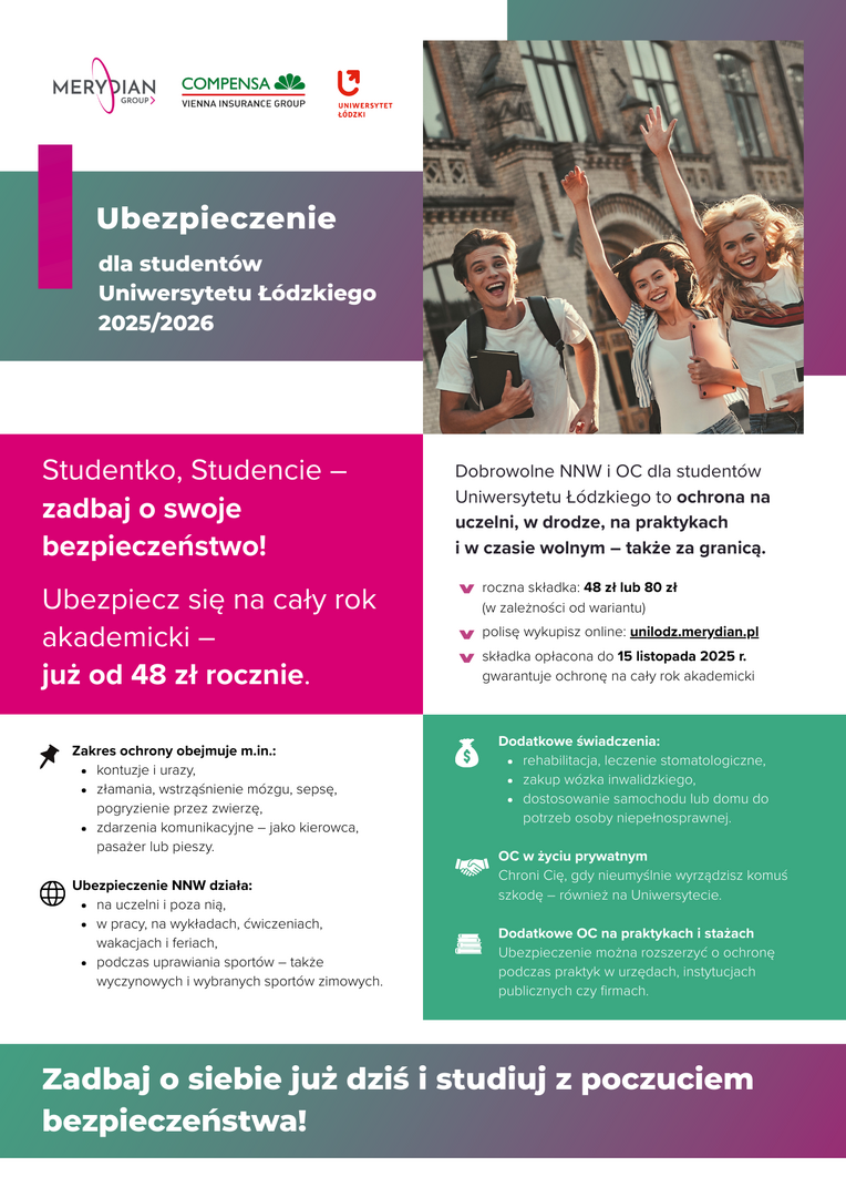Roczna składka ubezpieczenia w tym zakresie na rok akademicki 2025/2026 wynosi 48 zł lub 85 zł (w zależności od wybranego wariantu). Ubezpieczenie można zawrzeć wyłącznie poprzez stronę internetową: unilodz.merydian.pl